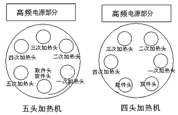 本設備采用旋轉式結構,鑄鋁轉盤上均勻分布6個工件支撐頭,轉盤每次轉60度角;氣動升降;安裝四個或五個感應頭同時加熱、每個鍋底均經四到五次加熱。